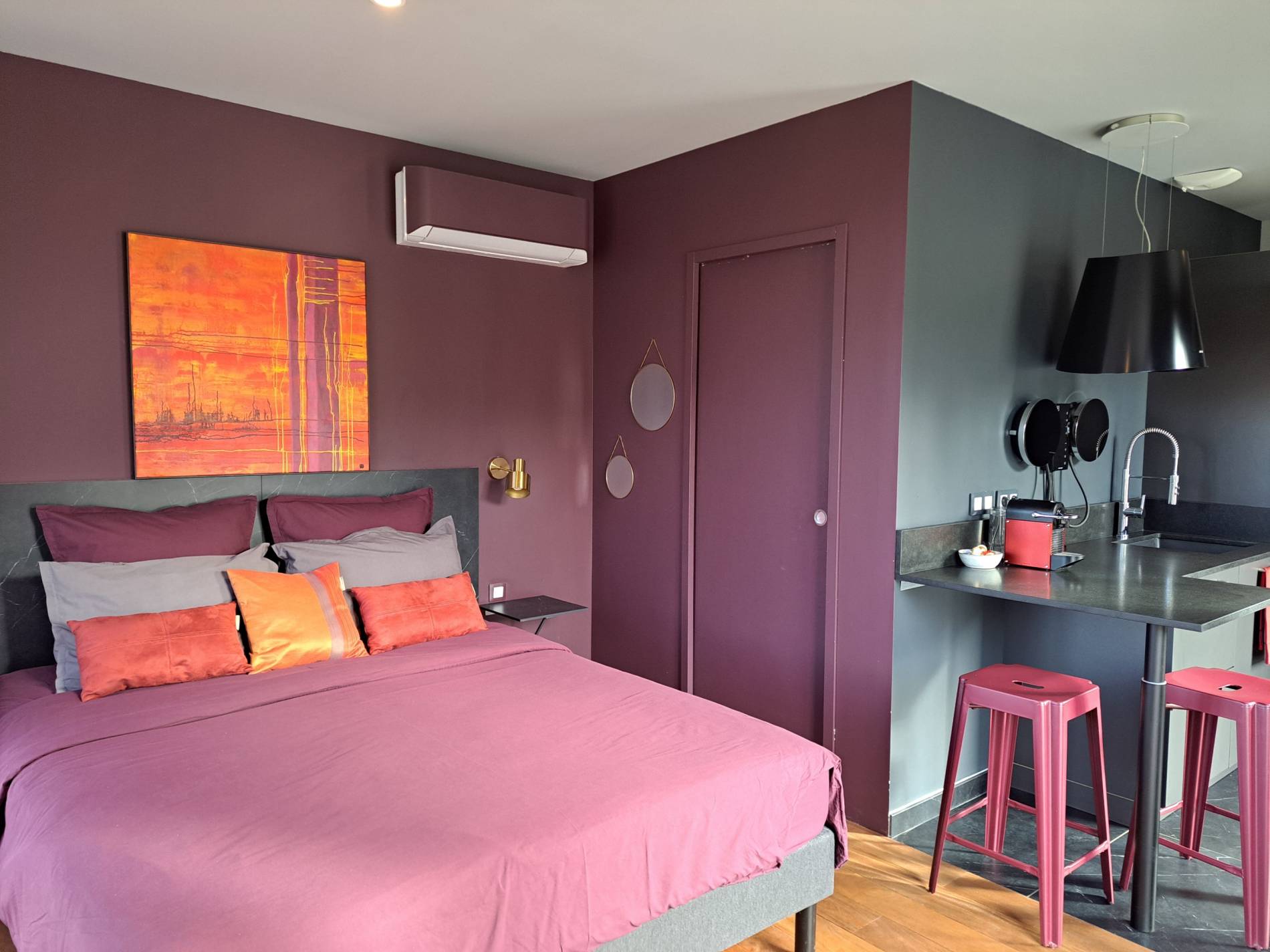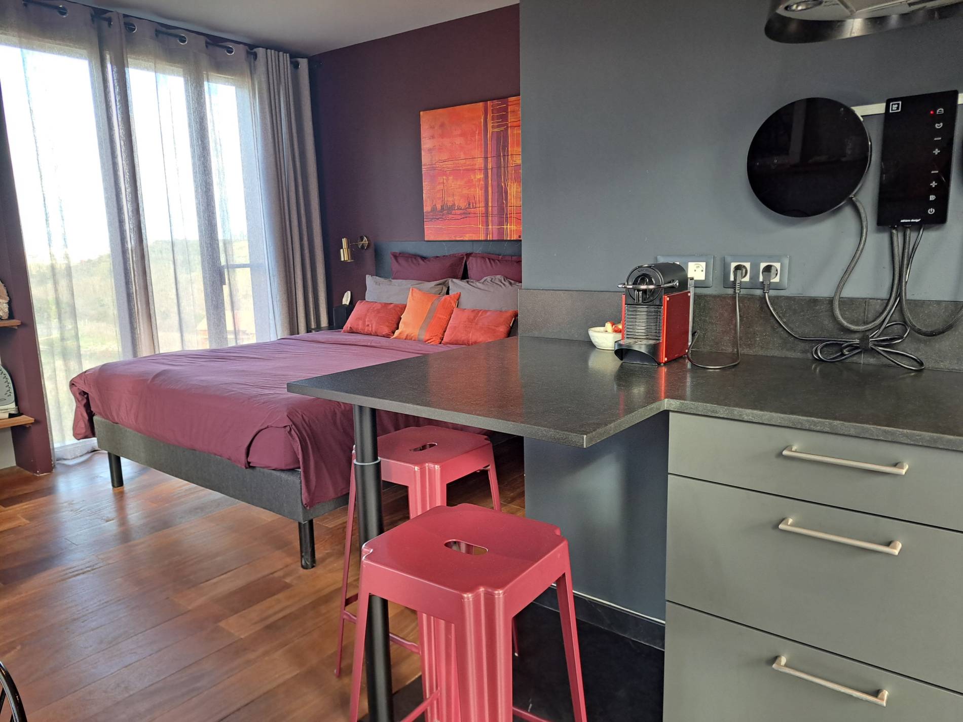 Ce studio a été pensé pour être un petit nid douillet cosy et romantique avec un grand lit (160x200), draps en percale, une tres belle salle de bain avec une grande douche à l'italienne et une très belle petite cuisine. Vous pourrez profiter d'une belle vue et coucher de soleil .