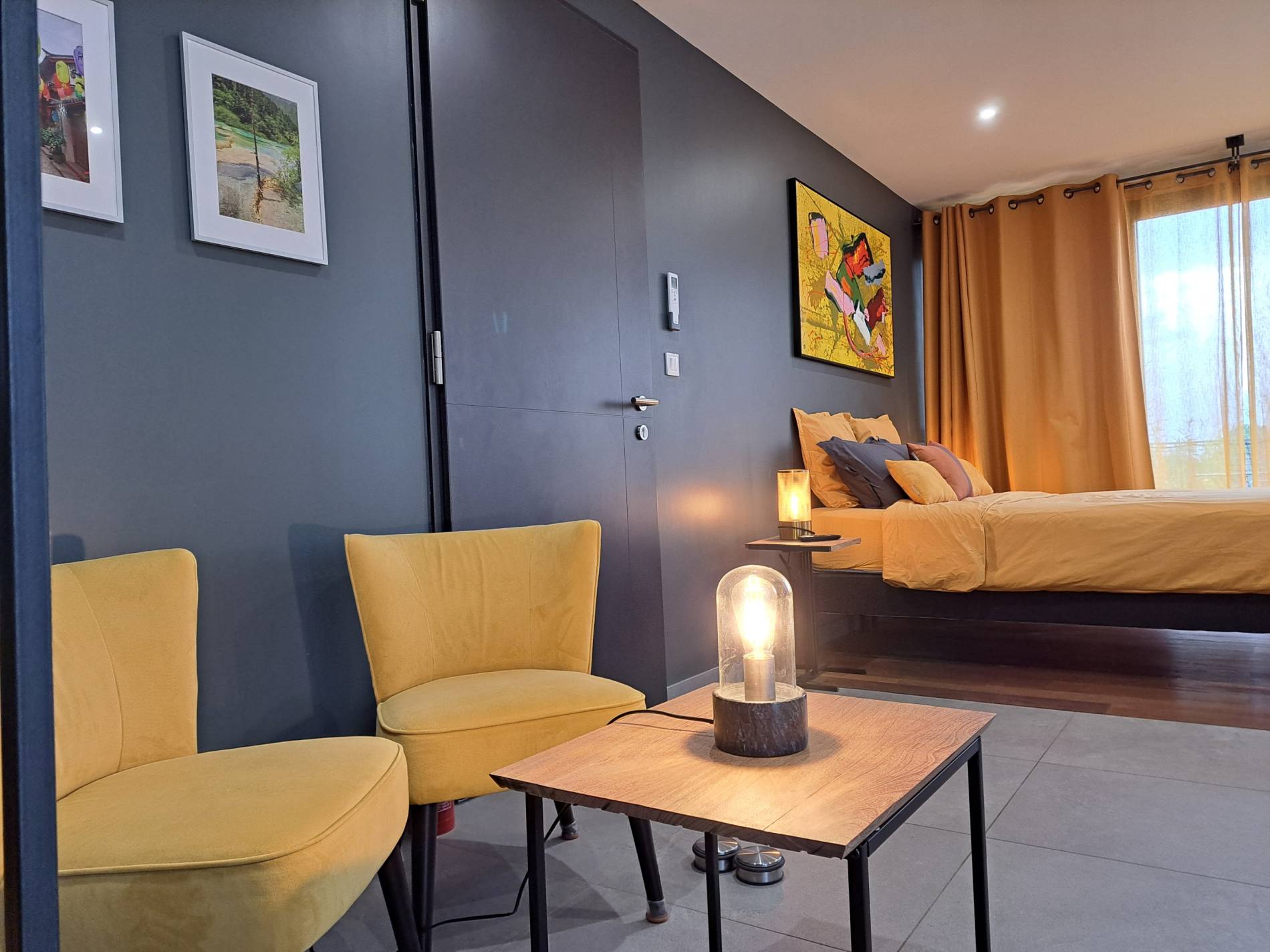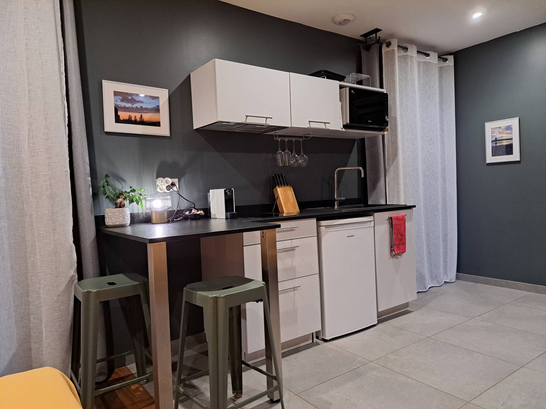 Studio n°2 : design, cosy et très bien équipé avec terrasse privative qui offre une belle vue sur le paysage vallonné en journée et les lumières de la ville en soirée. Cuisine et mobilier de qualité. La cuisine, entre autres, inclus deux plaques à induction et un micro-ondes combiné. La salle de bain inclut une grande douche à l'italienne.