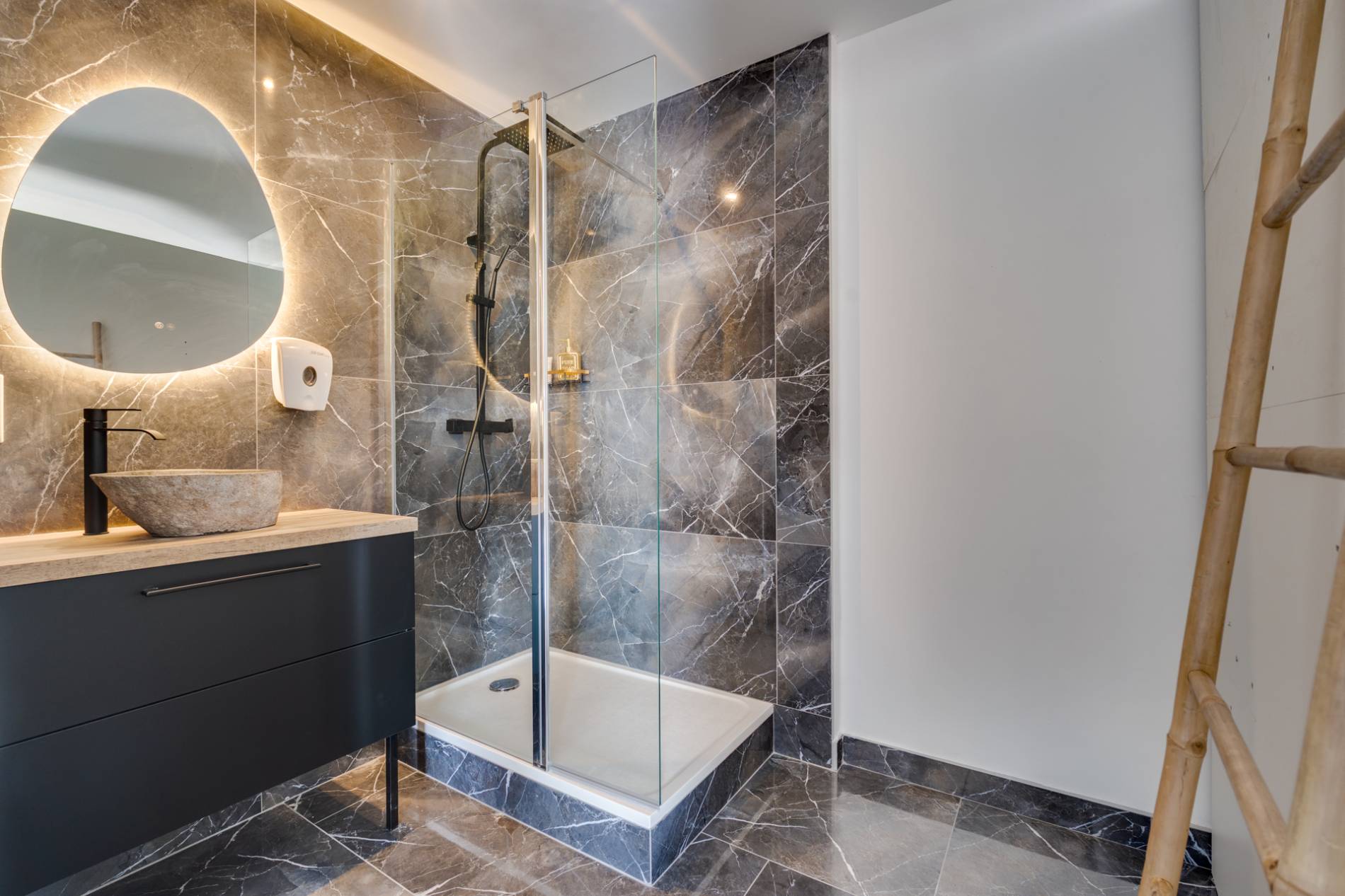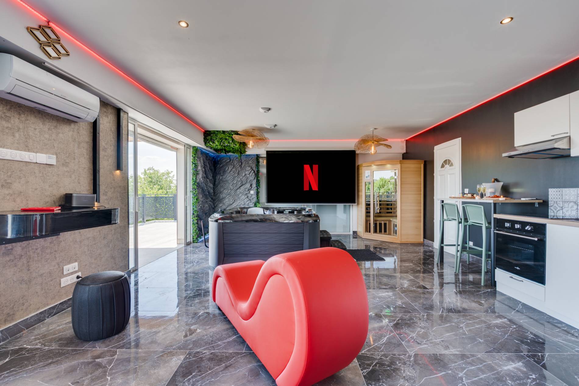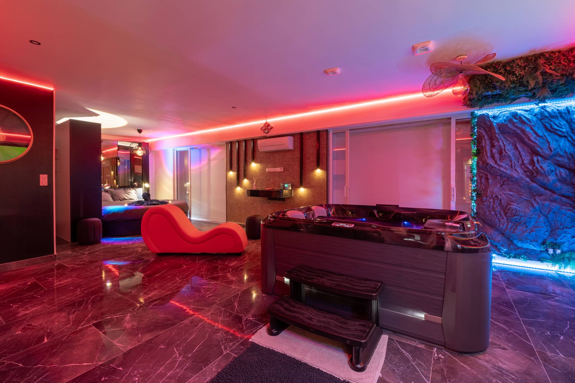 L'expérience bien-être est au cœur de cette suite, qui dispose d'un jacuzzi et d'un hammam totalement privatifs. L'espace nuit se compose d'un lit rond XXL de 2,50 mètres, positionné face à la vue pour des réveils inoubliables. Le confort est complété par une climatisation réversible, des jeux de lumières immersifs et un fauteuil tantra apportant une touche de sensualité. Côté divertissement, un vidéoprojecteur HD avec accès aux plateformes de streaming et une connexion Wi-Fi haut débit sont à votre disposition.