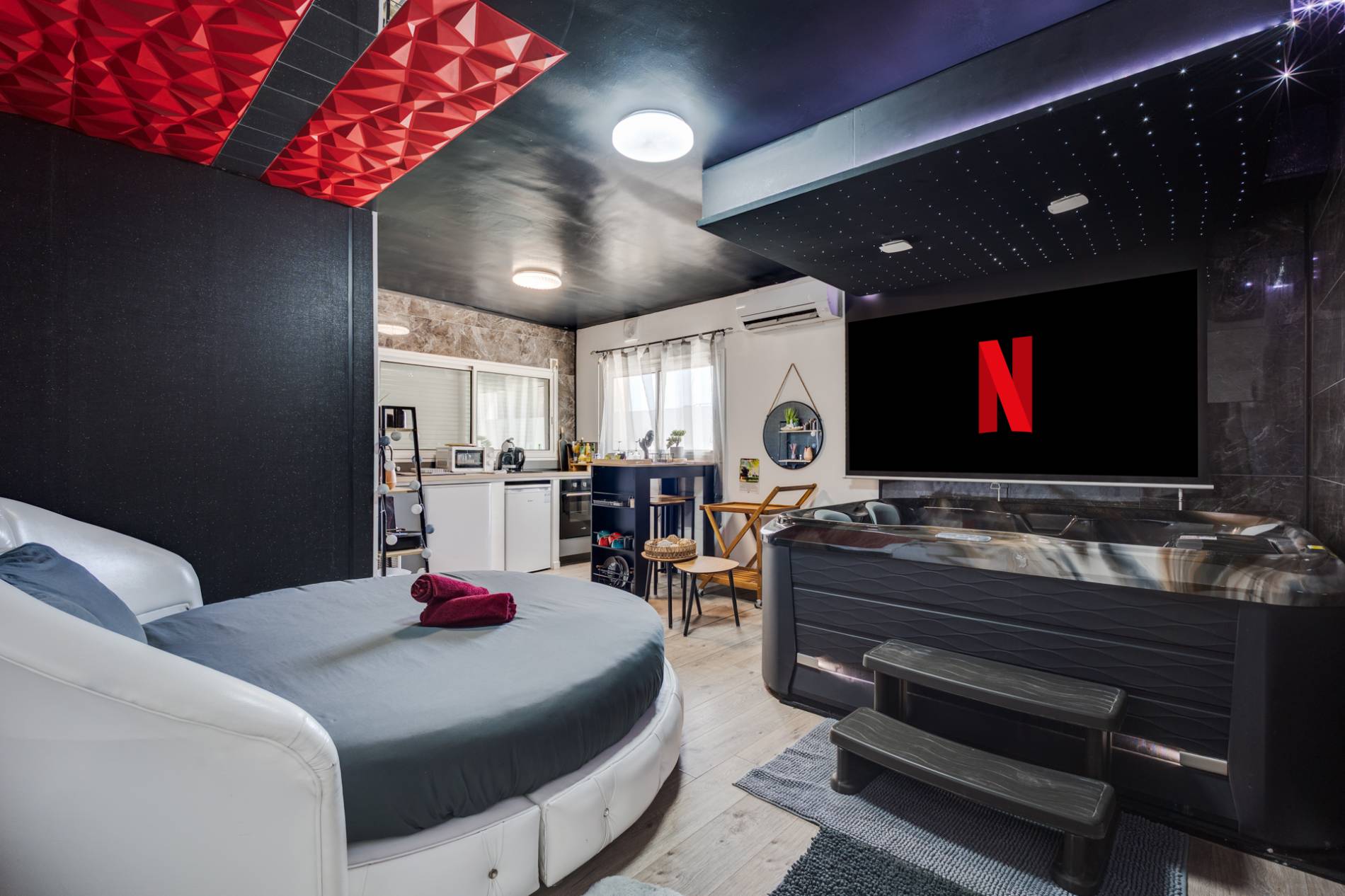 Le séjour s'articule autour de prestations haut de gamme dédiées à la détente et au romantisme. L'élément central est un spa entièrement privé, équipé d'un système de filtration UV pour une hygiène irréprochable. Pour prolonger l'expérience, la chambre dispose d'un lit rond XXL unique de 2,20 mètres, surmonté d'un ciel étoilé pour une ambiance cosy et tamisée. Le confort est assuré par une climatisation réversible et une connexion Wi-Fi haut débit.