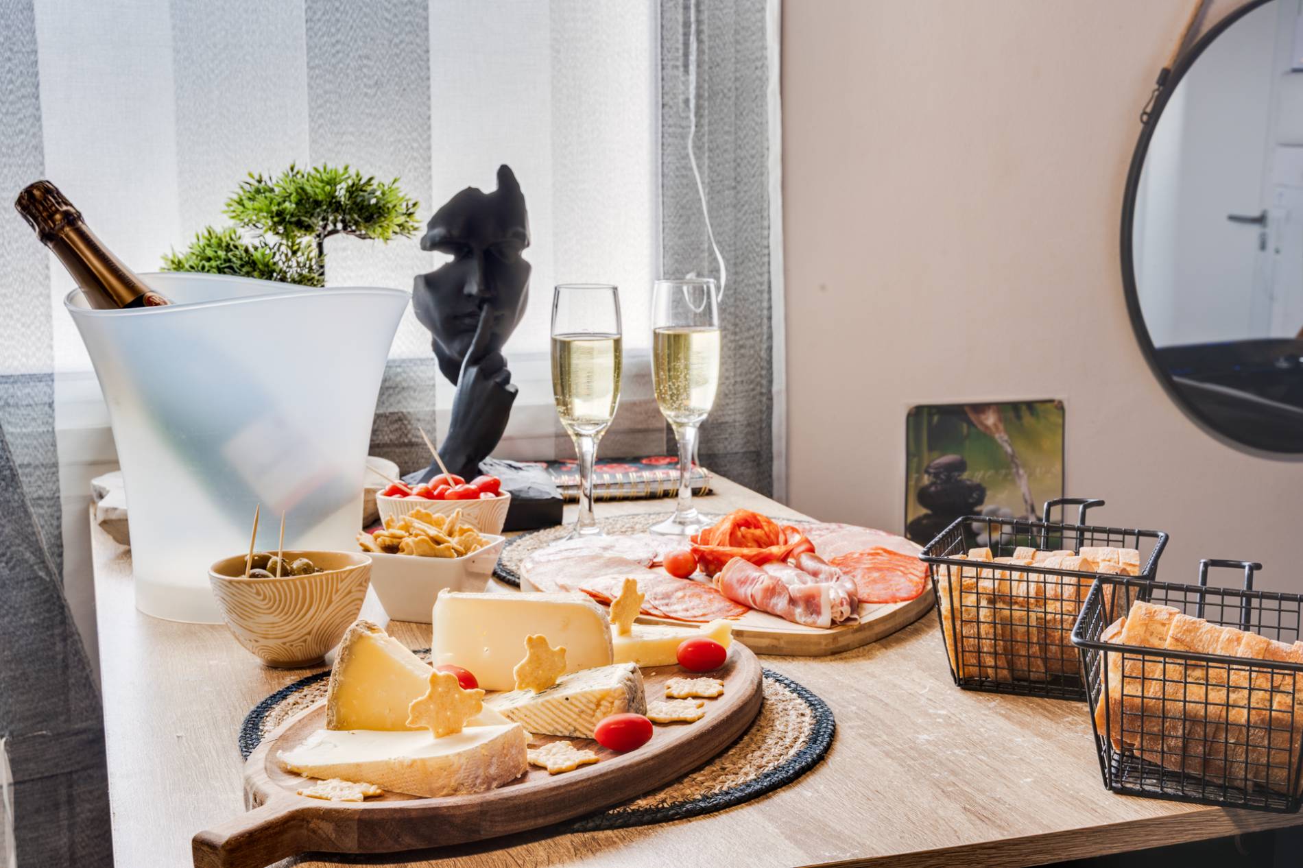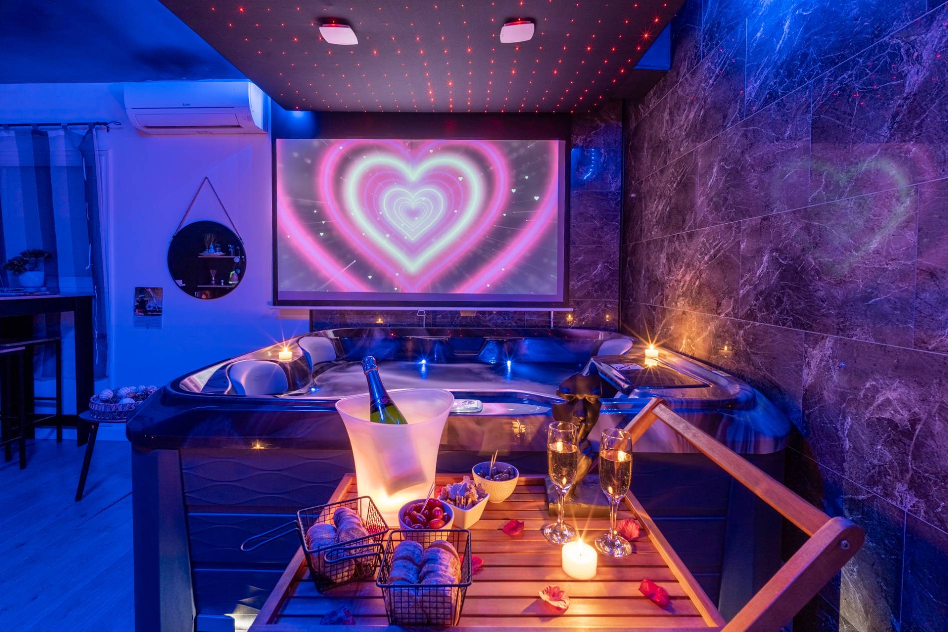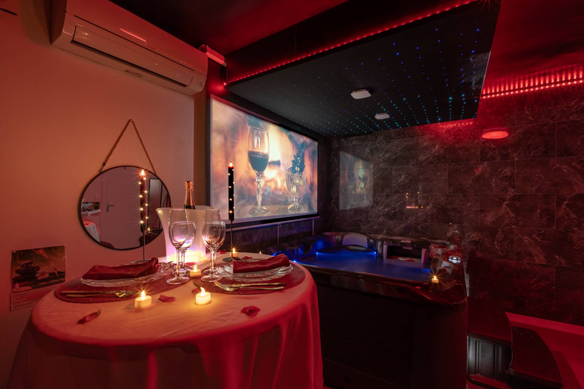 Côté divertissement, un vidéoprojecteur HD permet de profiter de vos contenus favoris en toute immersion. Les serviettes et le linge de lit sont fournis, et un plateau de courtoisie avec thé et café est à votre disposition dès votre arrivée. Pour rendre votre surprise encore plus mémorable, nous proposons différentes formules romantiques personnalisables sur demande.